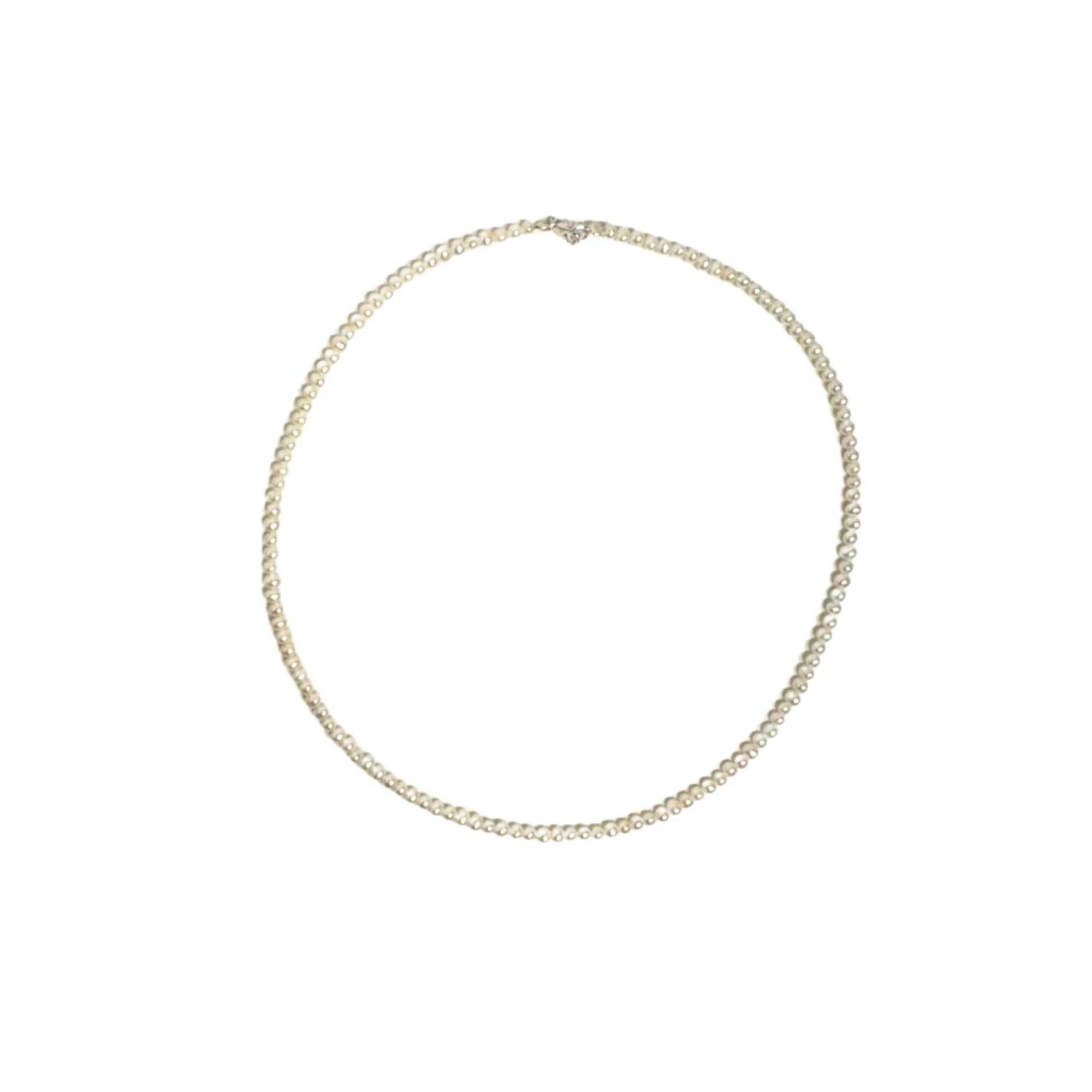 100 pearls on each necklace, just long enough to sit above the collarbone.